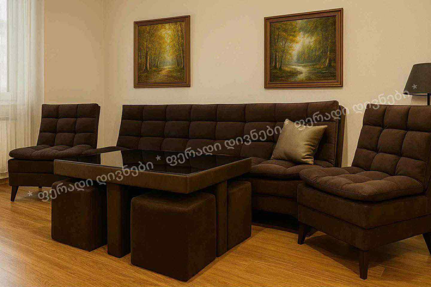 სამეული – 750 ლარი ჟურნალის მაგიდა 4 პუფით 250 ლარი მთლიანი კომპლექტის ფასი – 1000 ლარი, განვადებით 1050 ლარი